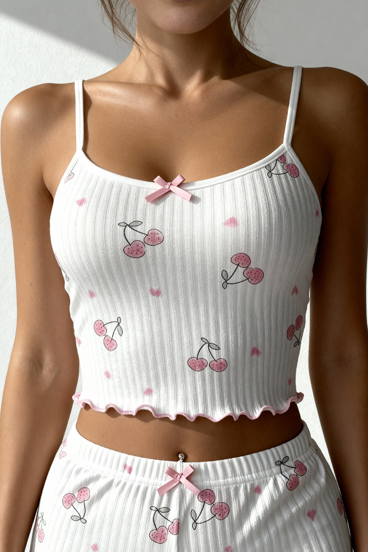 Enamórate de la comodidad con nuestro conjunto de pijama acanalado de corazón. Diseñado con delicados detalles en forma de corazón, pequeños lazos y un dobladillo festoneado, este encantador conjunto de dos piezas es la mezcla perfecta de lindo y acogedor. La camiseta ajustada con tirantes ajustables te abraza suavemente, mientras que los pantalones cortos de cintura alta ofrecen un estiramiento suave y una silueta favorecedora. Ya sea que estés descansando o preparándote para la noche, este conjunto trae un poco de romance a tu rutina.