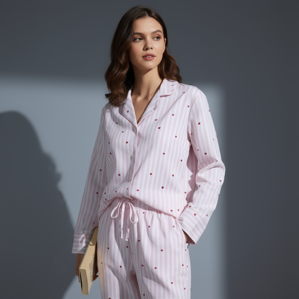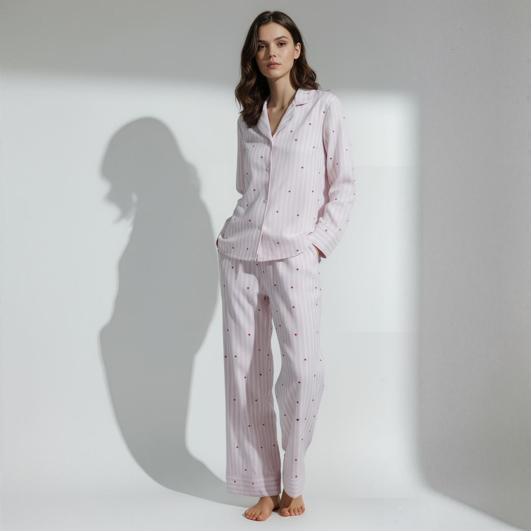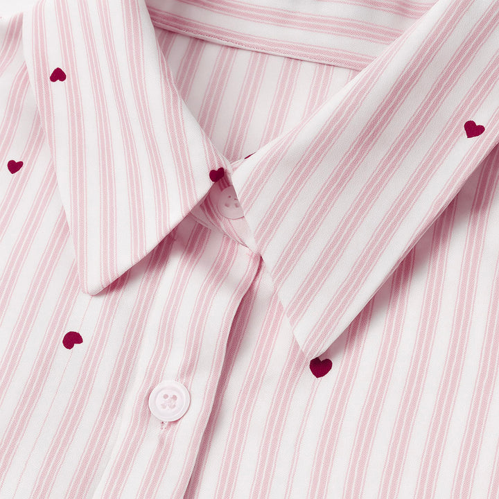 Crafted from premium, lightweight fabric that feels smooth against your skin, this set keeps you comfortable all night long. The blush pink stripes and delicate heart details add a romantic, feminine touch, perfect for cozy nights in or slow weekend mornings.